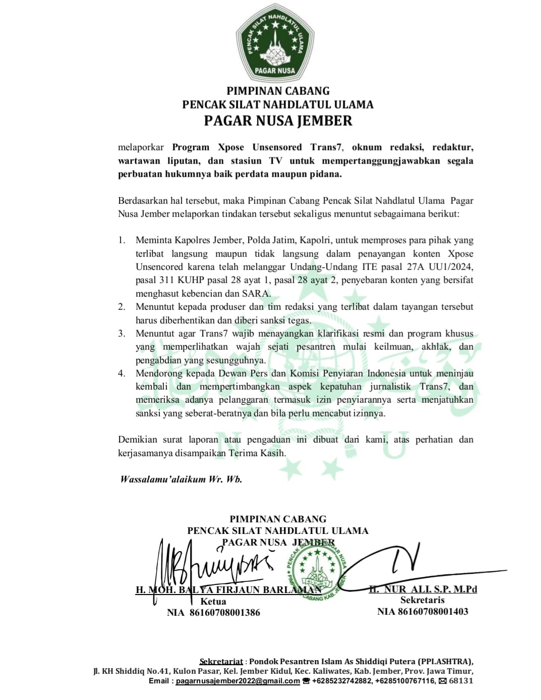 Meminta Kapolres Jember, Polda Jatim, dan Kapolri untuk memproses hukum pihak yang terlibat dalam tayangan Xpose Uncensored Trans7 karena diduga melanggar UU ITE Pasal 27A, 27U/2024, dan Pasal 311 KUHP tentang penyebaran konten fitnah serta ujaran kebencian.