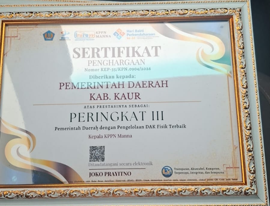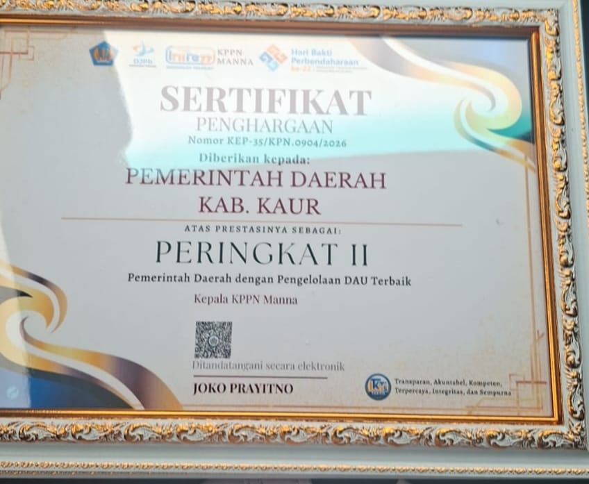 ” Sertifikat penghargaan diberikan Kepala Kantor Pelayanan Perbendaharaan Negara (KPPN) Manna Joko Prayitno yang diterima Kepala Badan Pengelolaan Keuangan dan Aset Daerah Kabupaten Kaur (BPKAD) Harles Feferman, SE, MM Rabu 4 Maret 2026.
