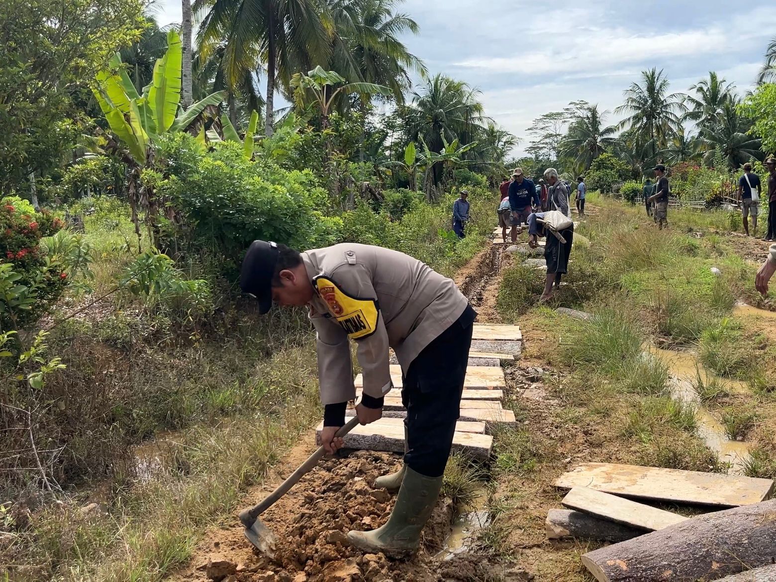 Personel PosPol Marga Belimbing bersama masyarakat setempat bahu-membahu melakukan perbaikan jalan dengan membersihkan badan jalan, menimbun bagian yang rusak, serta merapikan jalur agar dapat dilalui dengan lebih aman dan nyaman.