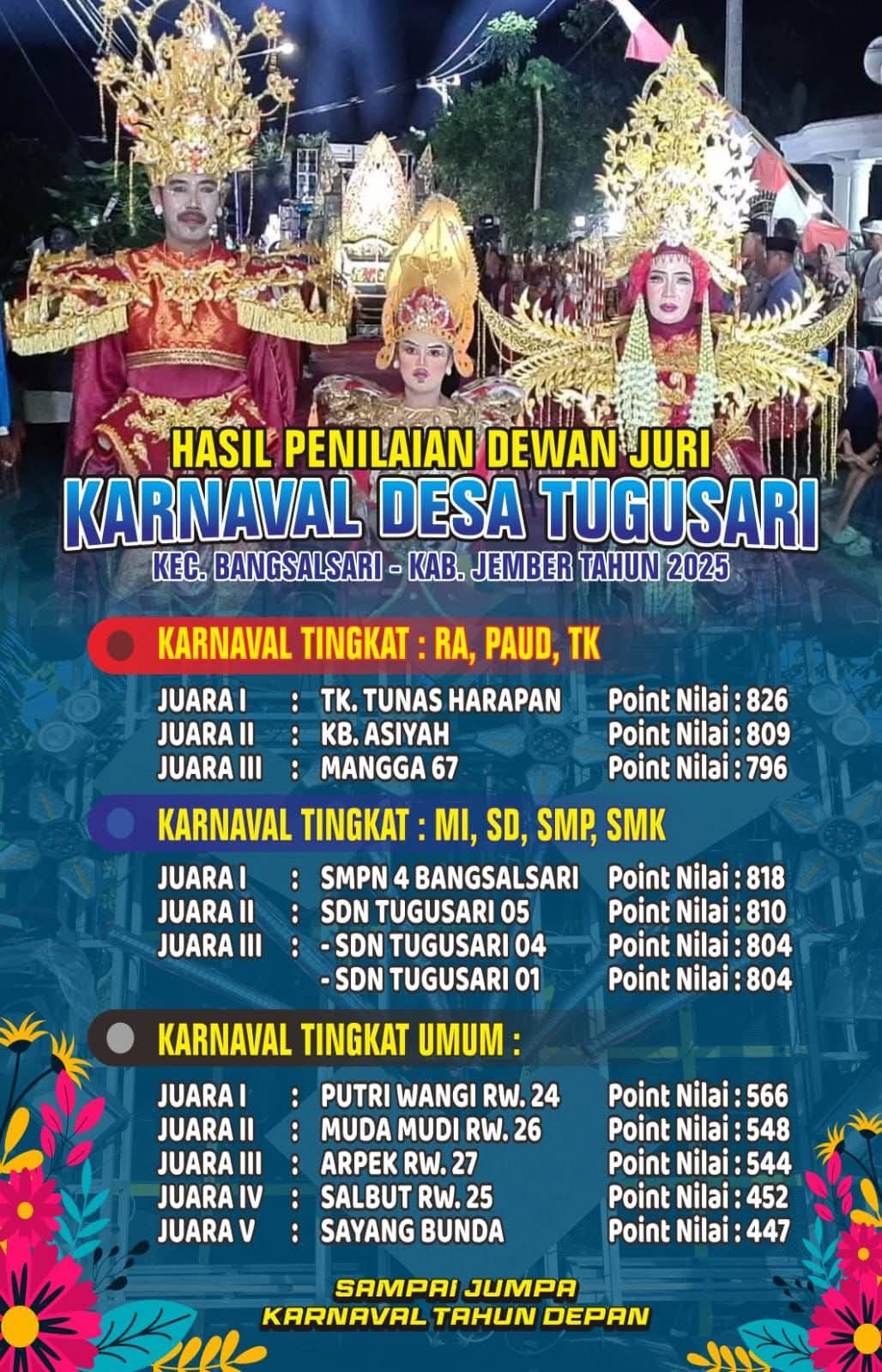 “Kegiatan karnaval dalam rangka HUT ke-80 Republik Indonesia ini menjadi wadah bagi masyarakat Tugusari untuk mengenalkan sekaligus melestarikan budaya nusantara. Melalui keberagaman kostum, tarian, dan kreasi yang ditampilkan, kita tidak hanya merayakan kemerdekaan tetapi juga menanamkan nilai cinta tanah air serta kebanggaan terhadap warisan budaya bangsa kepada generasi muda. Semoga semangat gotong royong dan persatuan yang tampak dalam karnaval ini terus hidup dalam kehidupan sehari-hari masyarakat Tugusari,” Jelasnya.
