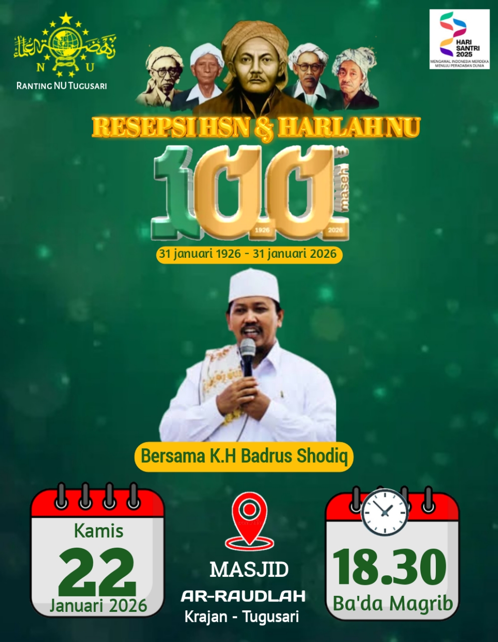 “Dari seluruh ranting NU di wilayah MWC NU Bangsalsari, baru Ranting NU Tugusari yang mampu menggelar resepsi HSN dan Harlah NU Satu Abad. Ini menunjukkan semangat dan kekompakan pengurusnya,” ungkapnya.