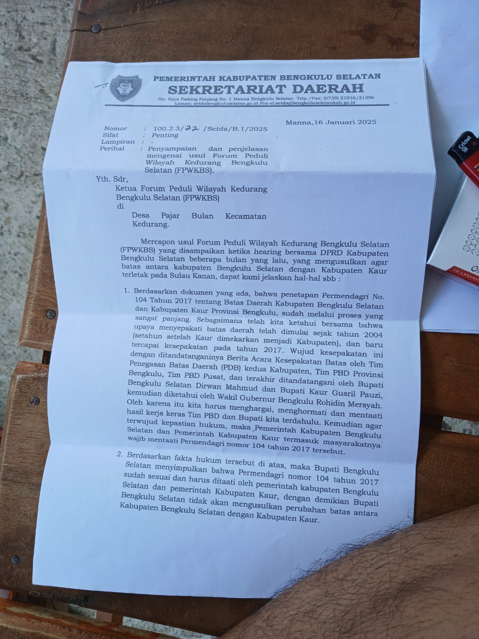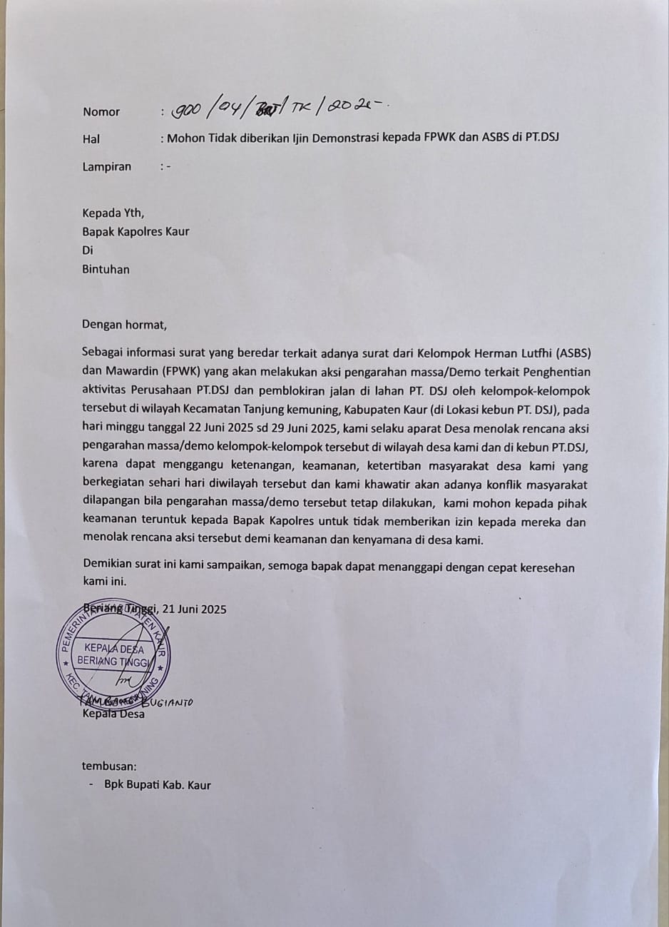 Kepala Desa Beriang tinggi ” Tambang Bugianto juga berkirim surat kepada Kapolres Kaur dan jajaran untuk permohonan penolakan atas demo oleh ASBS dan FPWK yang tidak mentaati keputusan yang ada , menurutnya berdasarkan Permendagri no 104 tahun 2017 itu sudah jelas untuk permasalahan tapal batas sudah selesai, kami tidak setuju adanya Demo di PT DSJ wilayah Kecamatan Tj Kemuning, sesuai dgn surat no 900/03/tk/2025 yang di tujukan kepada Kapolres Kaur.