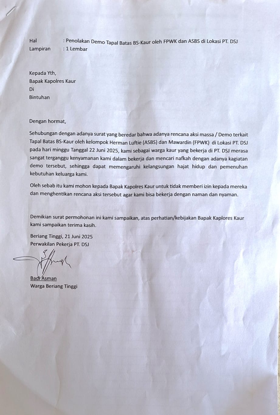 Kaur Bengkulu (rilisfakta.id) Perwakilan Pekerja PT DSJ kirim surat permohonan penolakan Demo tapal batas oleh ASBS dan FPWK di lokasi PT DSJ Kecamatan Tj Kemuning Kabupaten Kaur 21-06-2025.