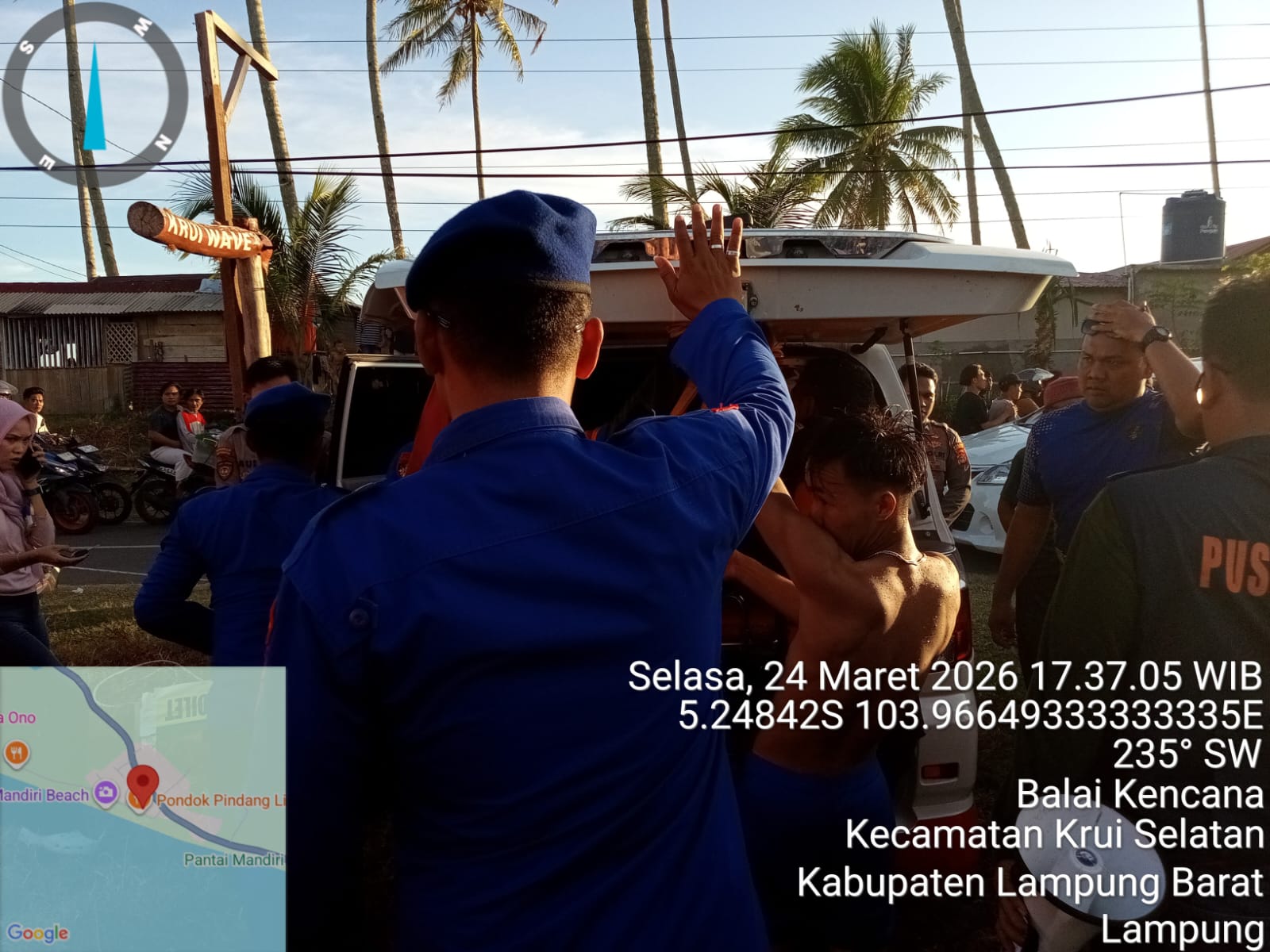 Pesisir Barat – Pada hari Selasa, 24 Maret 2026 sekira pukul 17.20 WIB, Tim SAR Gabungan menerima informasi dari masyarakat terkait penemuan satu orang mayat yang diduga merupakan korban tenggelam akibat terseret ombak di perairan Pantai Mandiri Sejati, Kecamatan Krui Selatan, Kabupaten Pesisir Barat. Peristiwa tenggelam tersebut diketahui terjadi pada hari Senin, 23 Maret 2026.