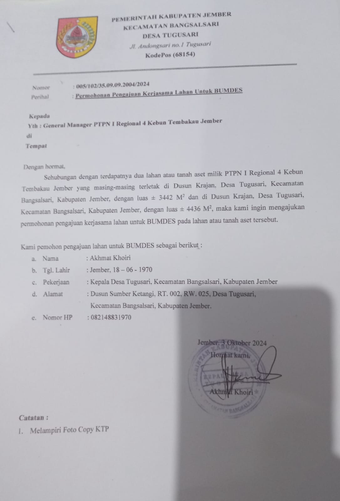 Diketahui bahwa kepala desa Tugusari pernah mengajukan ke PTP 10 tapi sampai hari ini belum ada jawapan dari PTPN.